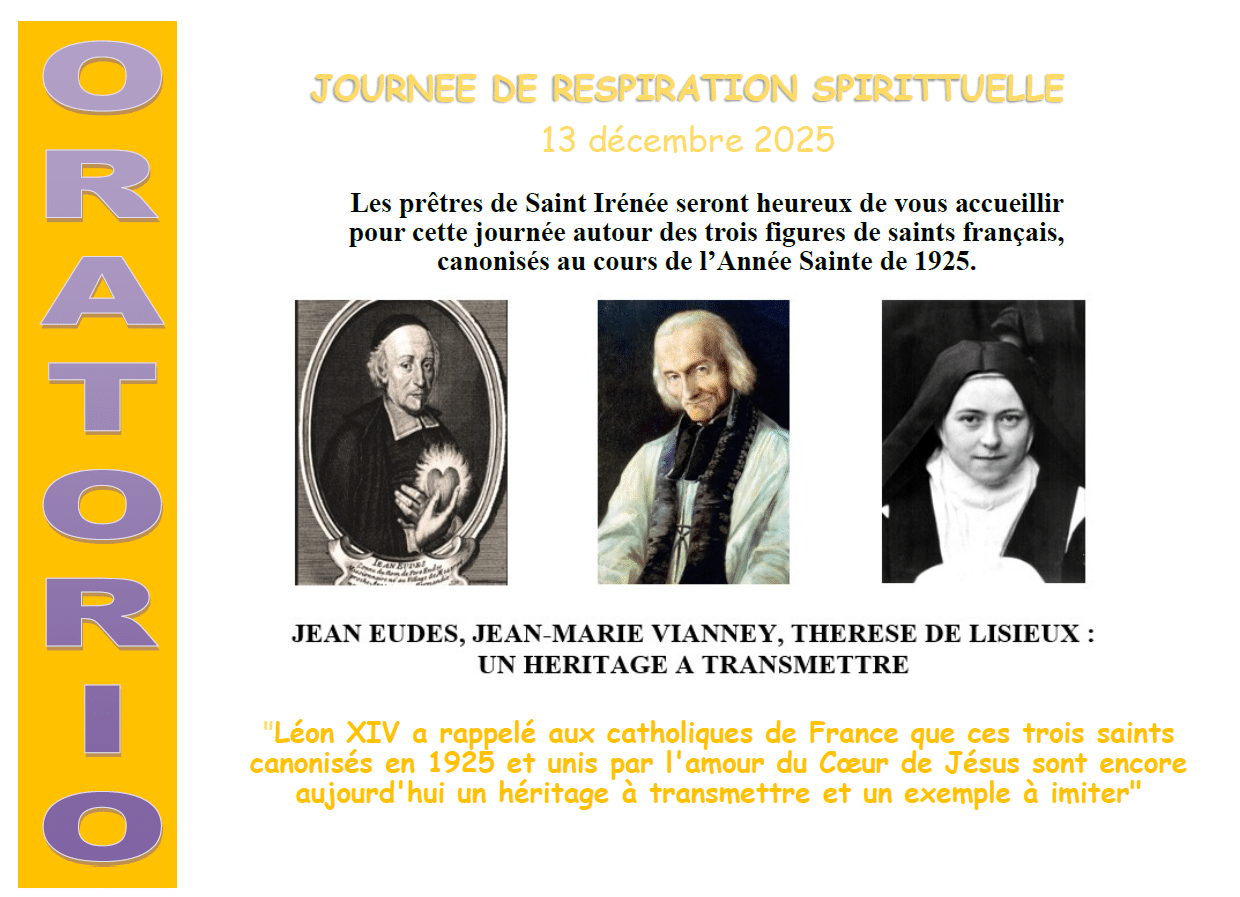Les prêtres de Saint Irénée seront heureux de vous accueillir pour cette journée autour des trois figures de saints français, canonisés au cours de l’Année Sainte de 1925;